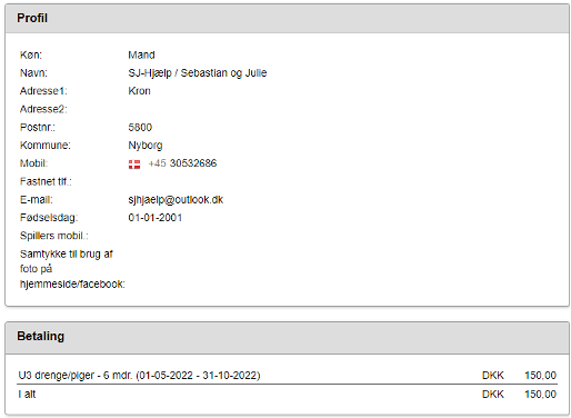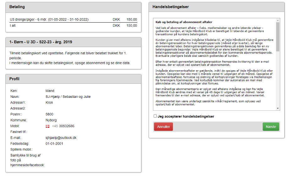 Process til indmeldelse Trin 1 - Opret Profil Første skridt er at oprette en profil med dine stamdata.Når profilen er oprettet, får du tilsendt en mail med dine log ind oplysninger til Conventus – vores medlemssystem. Trin 2 - Login på abonnementet Du skal bruge den tilsendte adgangskode til at logge ind.Dit brugernavn er den indtastede mailadresse. Trin 3 - Vælg en profil Her skal du vælge den profil, du ønsker at bruge.Hvis du har flere profiler oprettet på den samme mailadresse, vil der vises flere navne her. Trin 4 - Godkend medlemsoplysninger Du bliver bedt om at bekræfte dine medlemsoplysninger.Klik her på Næste, når de er rigtige. Trin 5 - Godkendelse af betaling Som næste skridt godkender du handelsbetingelser, holdet, du skal betale for samt betalingsintervallet. Trin 6 - Tast kontooplysninger Du skal taste dine kortoplysninger. Trin 7 - Godkend kort med MitID Du skal godkende din betaling med Mit-ID.OBS!! Når du bekræfter med Mit-ID, vises beløb 0,00 kr. Dette er en teknisk indstilling, det rigtige beløb trækkes, når du har godkendt med Mit-ID Trin 8 - Kvittering Du er færdig, og får tilsendt en mail med bekræftelsen på tilmelding. Kontingentet trækkes automatisk fremadrettet. Du kan melde dig ud her på hjemmesiden. Stor tak til vores sponsorer albani-logo@2xMeny_CMYK_SOLID_Logo_m_payoff-1Ragnar_ure_og_optikUBNFynsRideudstyrlogo-mbtshoejgaard-hestifokus
